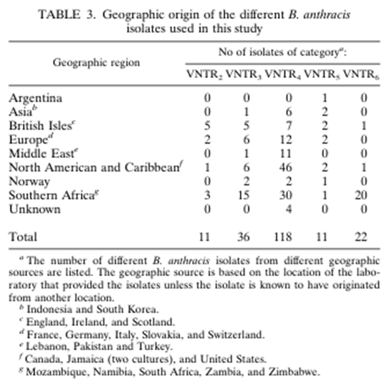 Práca „PCR analysis of tissue samples from the 1979 Sverdlovsk anthrax victims: The presence of multiple Bacillus anthracis strains in different victims“ (PCR analýza vzoriek tkanív obetí antraxu z roku 1979 vo Sverdlovsku. Prítomnosť viacerých kmeňov Bacillus anthracis u rôznych obetí) (Jackson PJ, Hugh-Jones ME, Adair DM, Green G, Hill KK, Kuske CR, Grinberg LM, Abramova FA, Keim P. PCR analysis of tissue samples from the 1979 Sverdlovsk anthrax victims: the presence of multiple Bacillus anthracis strains in different victims. Proc Natl Acad Sci U S A. 1998 Feb 3;95(3):1224-9. doi: 10.1073/pnas.95.3.1224) je na čítanie je ohromná lakôtka. Samozrejme musíte vedieť, čo hľadáte. Každá baktéria má totiž svoj molekulárny „podpis“. Tak sa dá určiť odkiaľ pochádza. Autori skúmali tzv. VNTR (variable number tandem repeats) Bacillus anthracis. A zistili, že vo vzorkách obetí absolútne prevláda VNTR 2 a VNTR 4 („The (VNTR)2 and (VNTR)4 categories predominate“). Akého pôvodu je VNTR 2 a VNTR 4 autori cudne zamlčali. To preto, lebo práca by nikdy nebola mohla byť publikovaná. Ale nechali odkaz, citáciu na prácu z roku 1996 (Jackson PJ, Walthers EA, Kalif AS, Richmond KL, Adair DM, Hill KK, Kuske CR, Andersen GL, Wilson KH, Hugh-Jones M, Keim P. Characterization of the variable-number tandem repeats in vrrA from different Bacillus anthracis isolates. Appl Environ Microbiol. 1997 Apr;63(4):1400-5. doi: 10.1128/aem.63.4.1400-1405.1997).