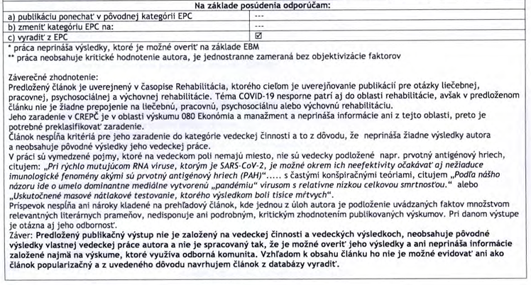 Teda: „druhý raz dokonca odporúčajú publikáciu neevidovať“ (teda v posudku c) vyradiť z EPC, „teda článok z databázy vyradiť“). Ak tomu dobre rozumiem, tak vyradiť z „Akademická knižnica UK“.