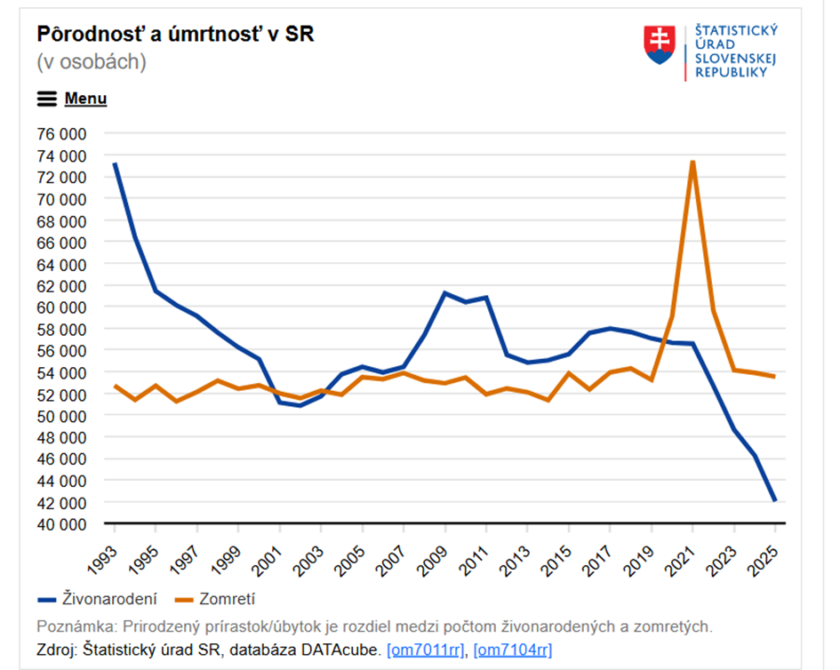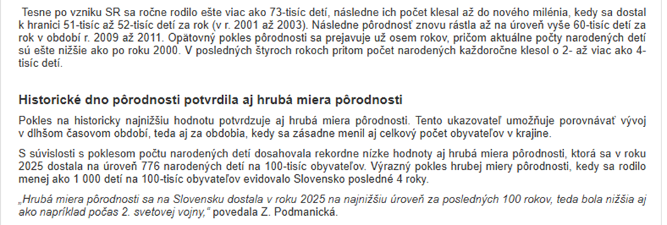 „Hrubá miera pôrodnosti sa na Slovensku dostala v roku 2025 na najnižšiu úroveň za posledných 100 rokov, teda bola nižšia aj ako napríklad počas 2. svetovej vojny,“ povedala Z. Podmanická.