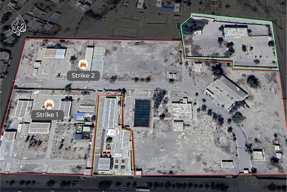 (Vizuálna analýza miest dopadu rakiet ukazuje vojenskú základňu (červená oblasť) a školu (zelená oblasť), zatiaľ čo komplex kliník (žltá oblasť) zostal úplne nepoškodený [Al Jazeera].)
