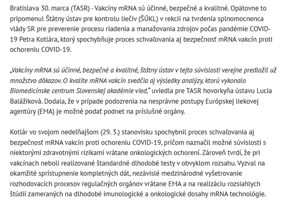 No a nakoniec. Bezpečnosť „vakcín“. Mediálny priestor je zahltený metodickým paškvilom z dielne SAV. Akosi sa „zabúda“ na súdnoznalecký posudok súdnej znalkyne MUDr. Soni Pekovej, PhD. (jeho abstrakt je tu: https://www.10letters.org/CzechResearch.pdf ) Mimo diskusie sú iné „drobnosti“. Napr. LNP, transfekcia, enhancer SV40, reverzná transkripcia, inkorporácia do ľudského genómu... JUDr. Ing. Banán by nám o tom mohol hodne porozprávať (https://www.lakota.sk/blog/spravy-4/banan-sosovica-citrusovnik-a-dna-71). Koniec-koncov sem paria aj „dobre utajené“ úmrtia, poškodenia zdravia, či depopulácia...“